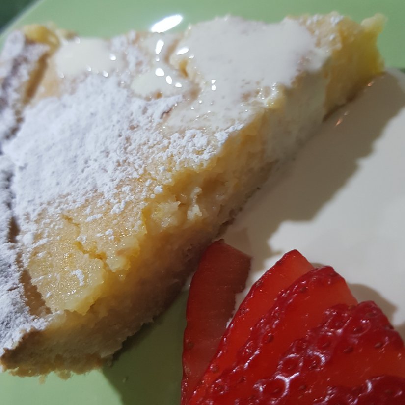 For the filling, break the eggs into a large bowl and whisk together with a wire whisk. Add the rest of the filling ingredients and whisk again until they are all well combined. Pour the filling mixture into the pastry case. To prevent it spilling as it goes in the oven, pour in most of the filling so it almost fills the tart, carefully sit the baking sheet and tart on the oven shelf, then top up with the rest of the filling to completely fill it. Bake for about 30-35 minutes or until just set but with a slight wobble in the centre.Leave to cool slightly then transfer the tart to a serving plate and serve warm or cold, dusted with sifted icing sugar and served with strawberries or raspberries.Just the job with little effort, so delicious…enjoy!!!!