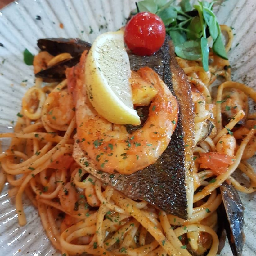 Creamy linguine pasta in a white wine and tomato sauce and a seafood mix of prawns, mussels and clams all topped of with the juiciest king prawn and crispy pan fried sea bass fillet. Was I in Rotherham or Sorrento????