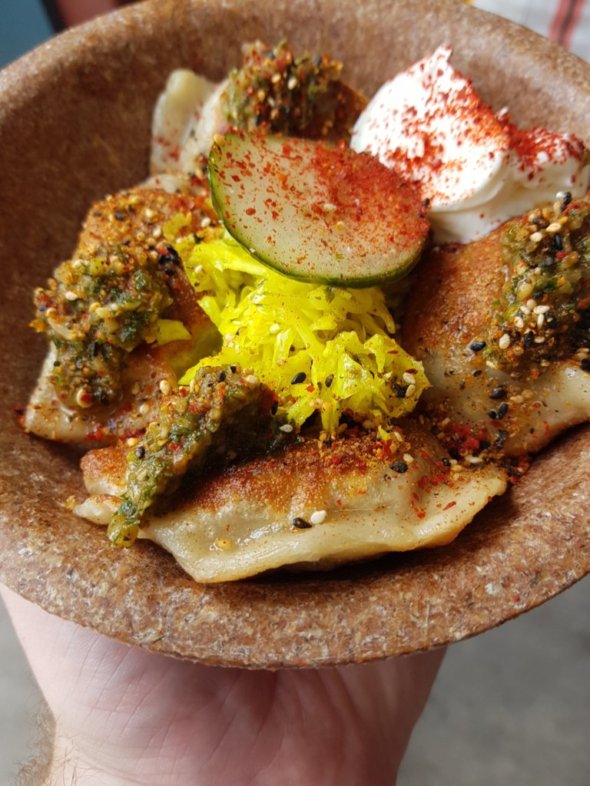Next up was Mokosh a Slavic kitchen and dumpling bar. Now must admit Im beginning to gain an obsession with dumplings, usually devouring the Asian version of this mighty little morsel but was attracted to this streetfood truck by the aromas gently passing in our direction. These delicately fried succulent dumplings were stuffed with pulled pork and served with sour cream, Slavic salsa and dill pickle. Quite a plateful for 8 quid…great value for money and so so tasty.