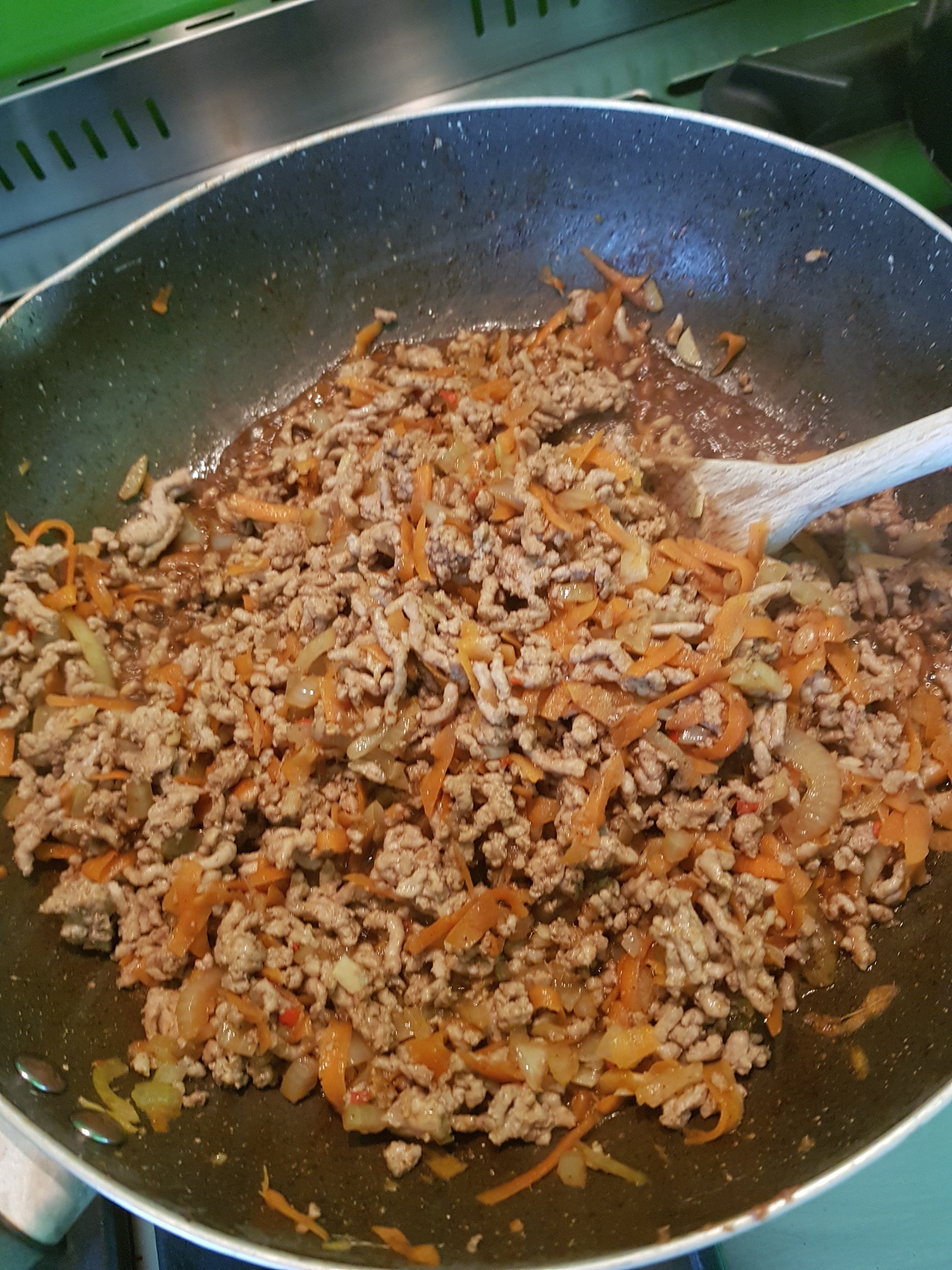 - Heat half the oil in large open wok, fry the pork mince until browned. Then remove from pan and stand to the side.